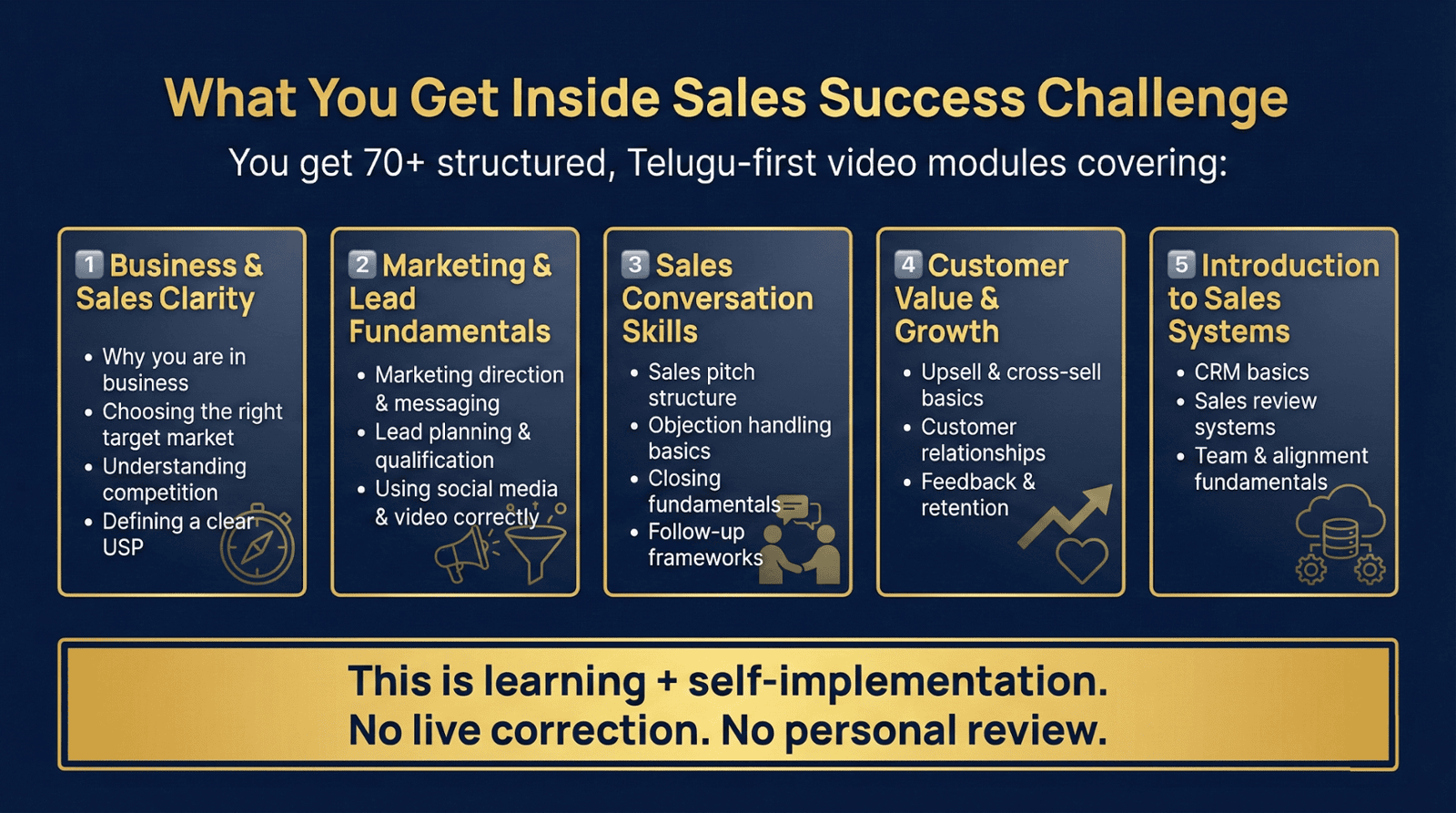 There are no live calls, no personal reviews, and no business diagnosis.